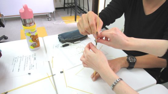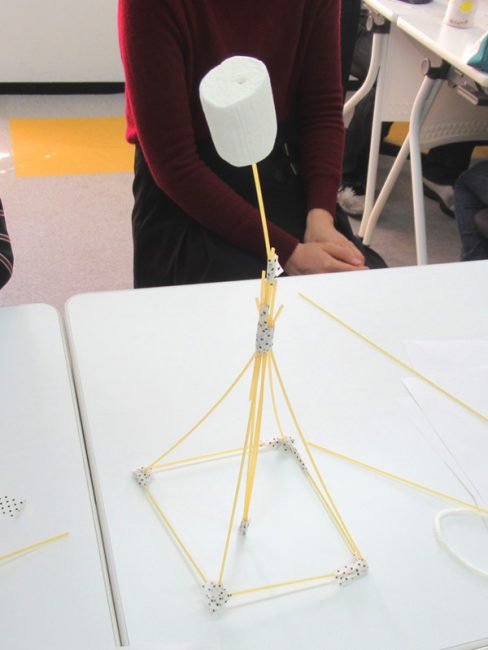 パスタで塔を建てるという初めての経験に、どういう形で組み立てればよいのか、どうすれば強度が強くなるのか、