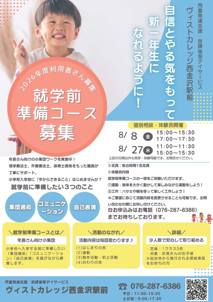 児童発達支援と放課後等デイサービスを提供するヴィストカレッジ西金沢駅前では、8月8日(金)、8月27日(金)に「就学前準備コース」と称して年長さん向けの小集団ワークを実施します。
