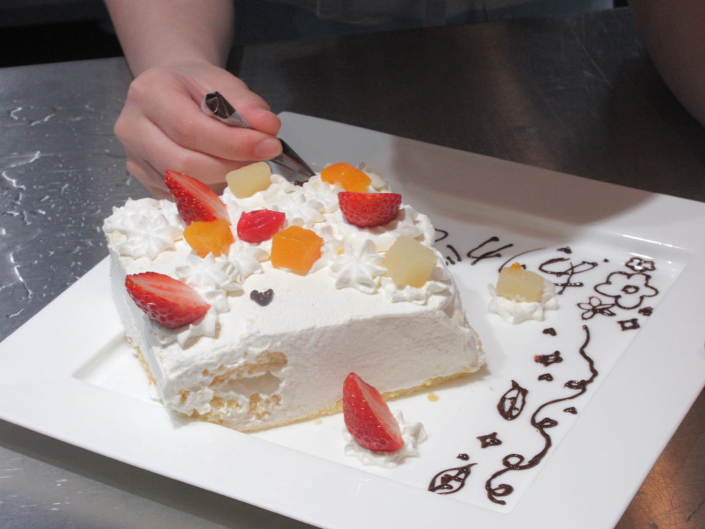 さらに、金沢食藝研究所の講師の方をお招きし、カステラを使ったショートケーキ作りに親子で挑んでいます。