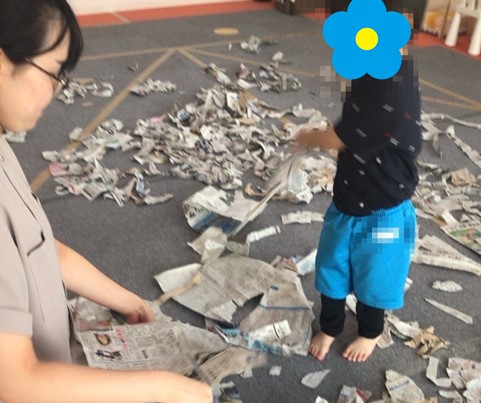 新聞を破るには多少力も必要で、思いっきり破る子もいれば恐る恐る破ることもいて、取り組み方は様々です。