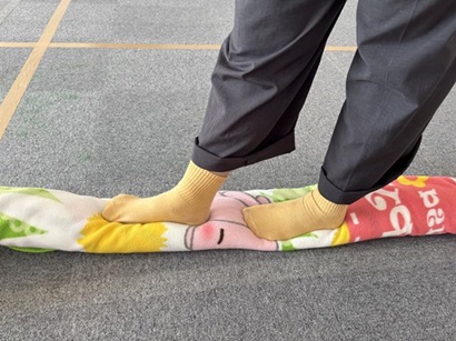 レベルを上げるなら…バスタオルを丸めて平均台のようにすると、不安定な中で渡るため、さらにバランスの向上に繋がります。