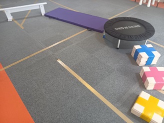 トランポリンや平均台を使ったコースを回ってもらいます。