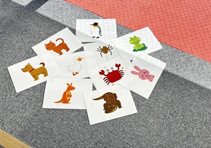 この活動は、動物のイラストを子どもに見てもらい、その動物の歩き方をマネして歩く運動です。