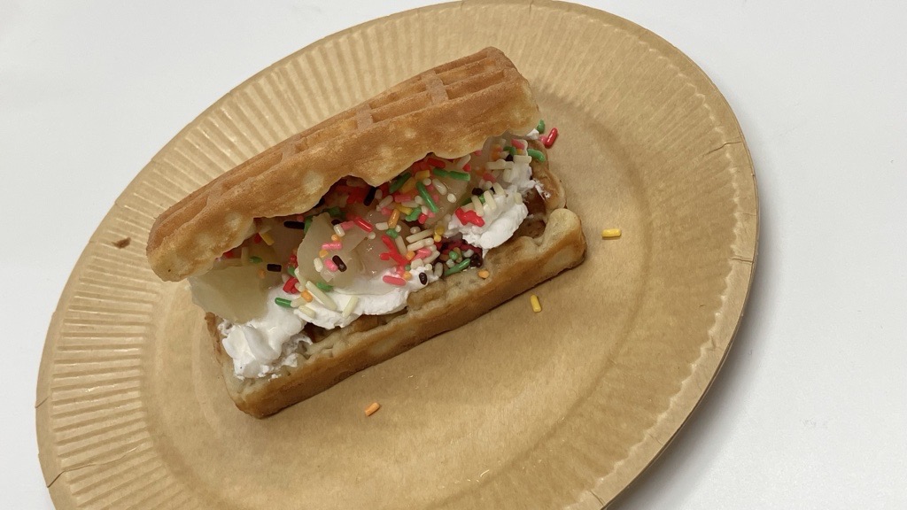 ホイップクリームや果物、チョコレートソースなどを使って、それぞれ思い思いにトッピングし、見た目も華やかでおいしそうなワッフルが完成しました。