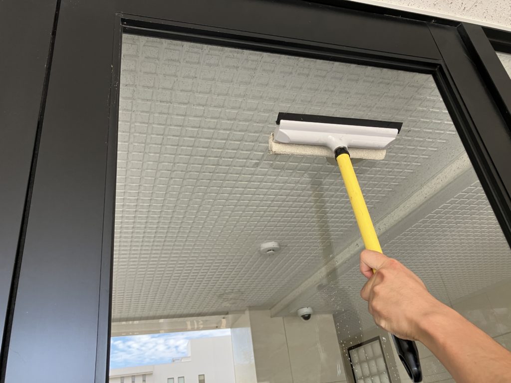 透明なガラス素材のドアは指の指紋が目立ちやすい箇所。スクイジー使って綺麗にしていきます。